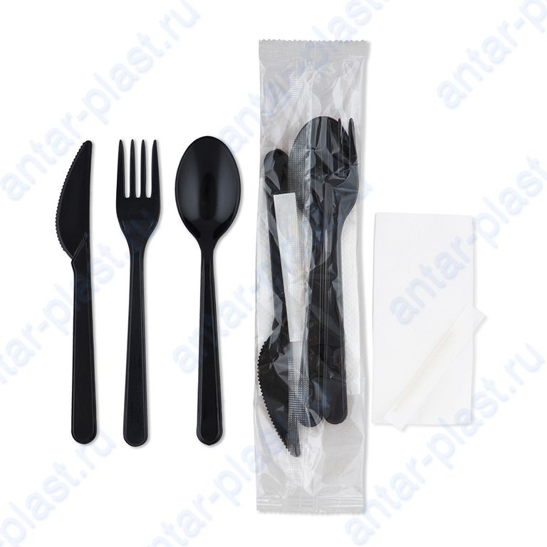 Комплект №5 (вилка черная, нож черный, ложка черная, зубочистка салфетка белая)