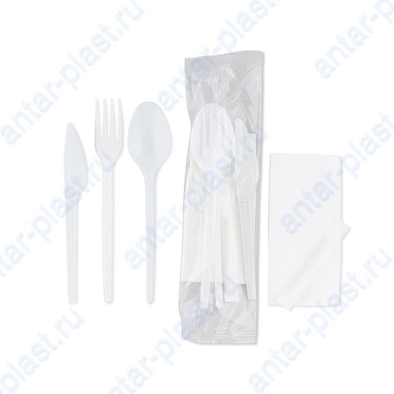 Комплект №5 ЭКОНОМ (вилка белая, нож белый, ложка белая, зубочистка, салфетка белая)